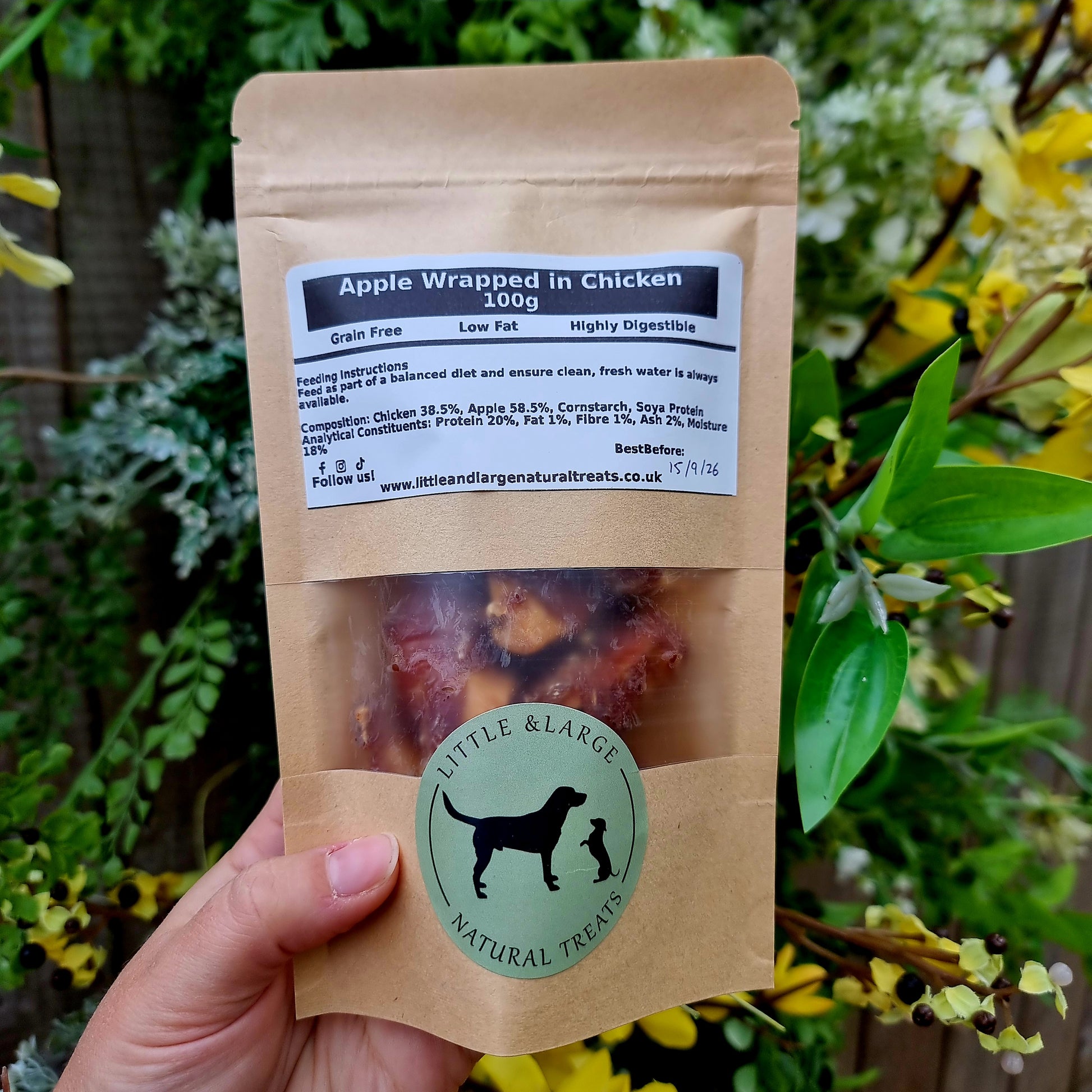Composition: Chicken 38.5%, Apple 58.5%, Cornstarch, Soya Protein