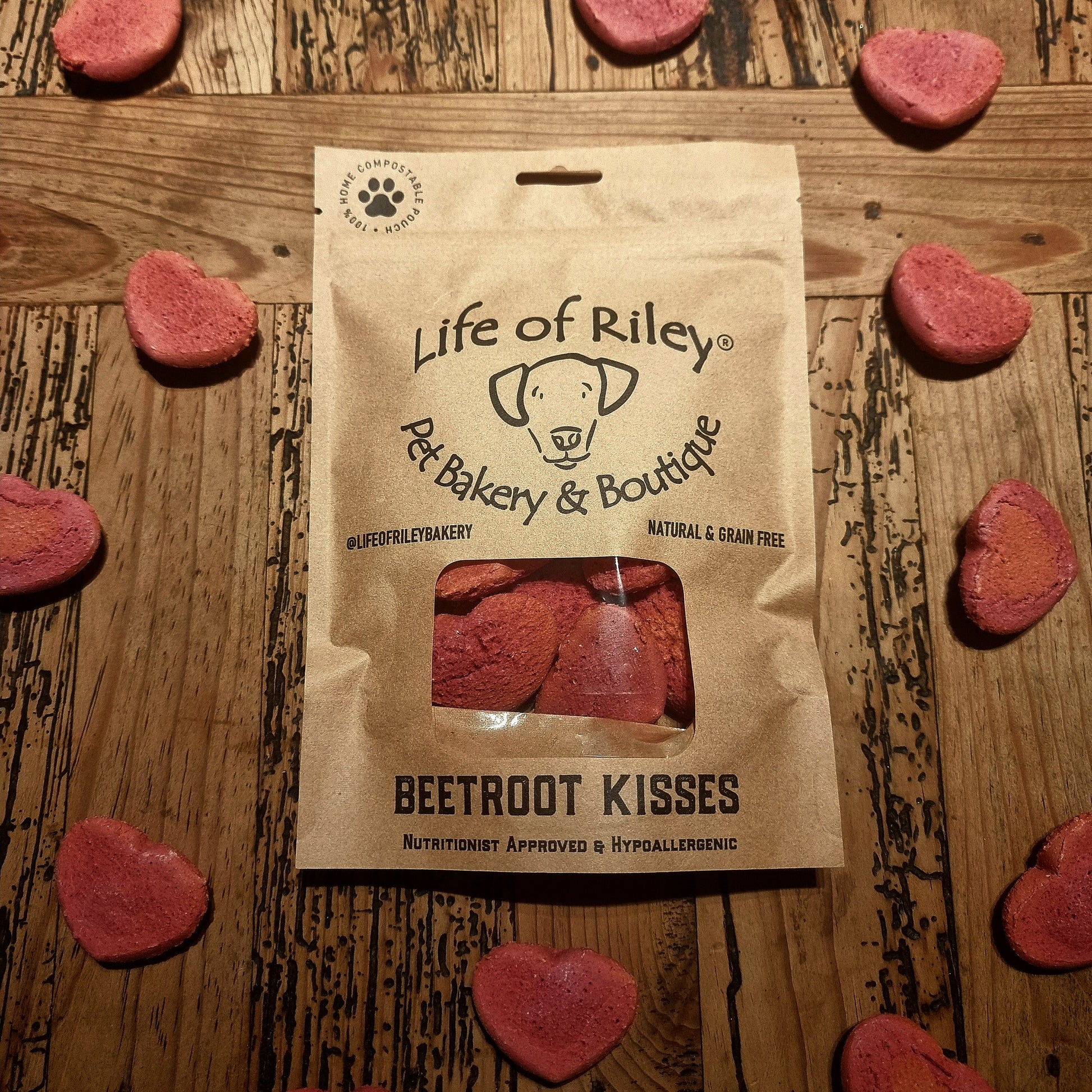 These biscuits are a blend of beetroot and peanut butter, dog's love the natural sweetness and they are definitely woof-approved and, best of all, 100% natural, hand baked and healthy!