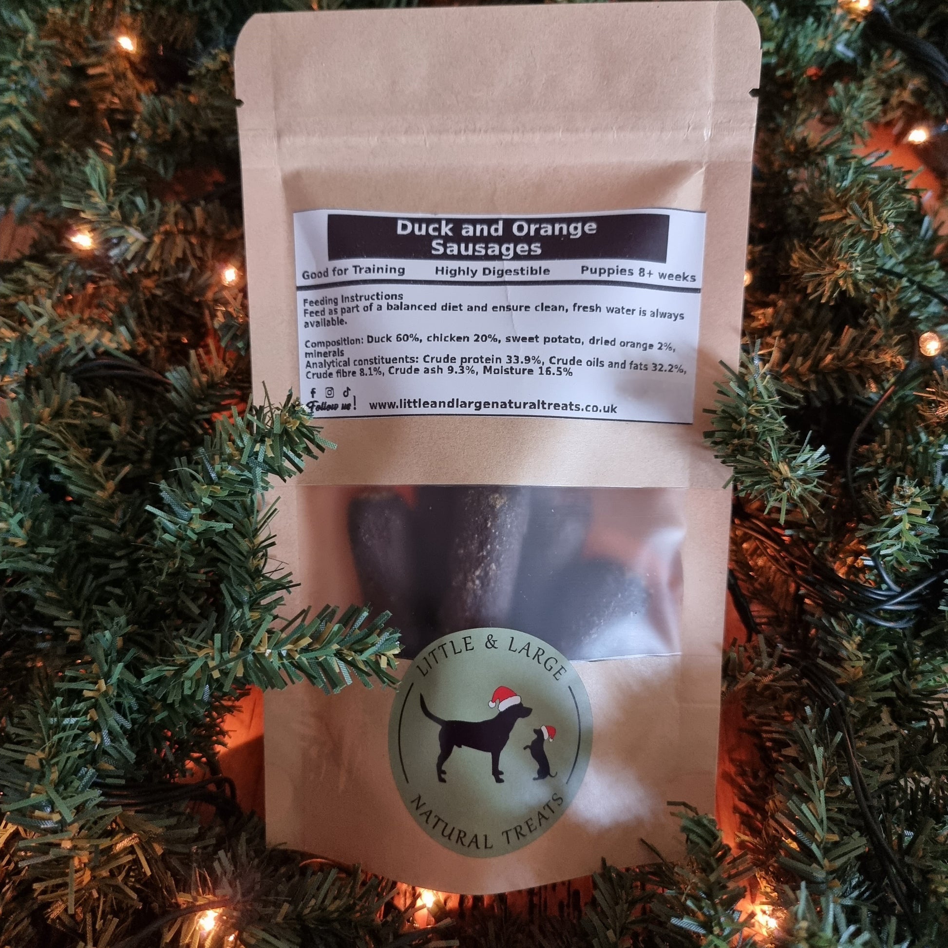 Make this holiday season extra special for your loyal companions with our festively mouth-watering delightful Duck and Orange Sausages that bring the flavour of Christmas to their taste buds. Crafted with care and packed with wholesome goodness, these scrumptious and nutritious treats will have tails wagging and noses sniffing in anticipation during the most wonderful time of the year. High in protein, grain-free, made from all-natural ingredients, perfect for all dogs, these treats can be served whole or cut into smaller pieces for training rewards.