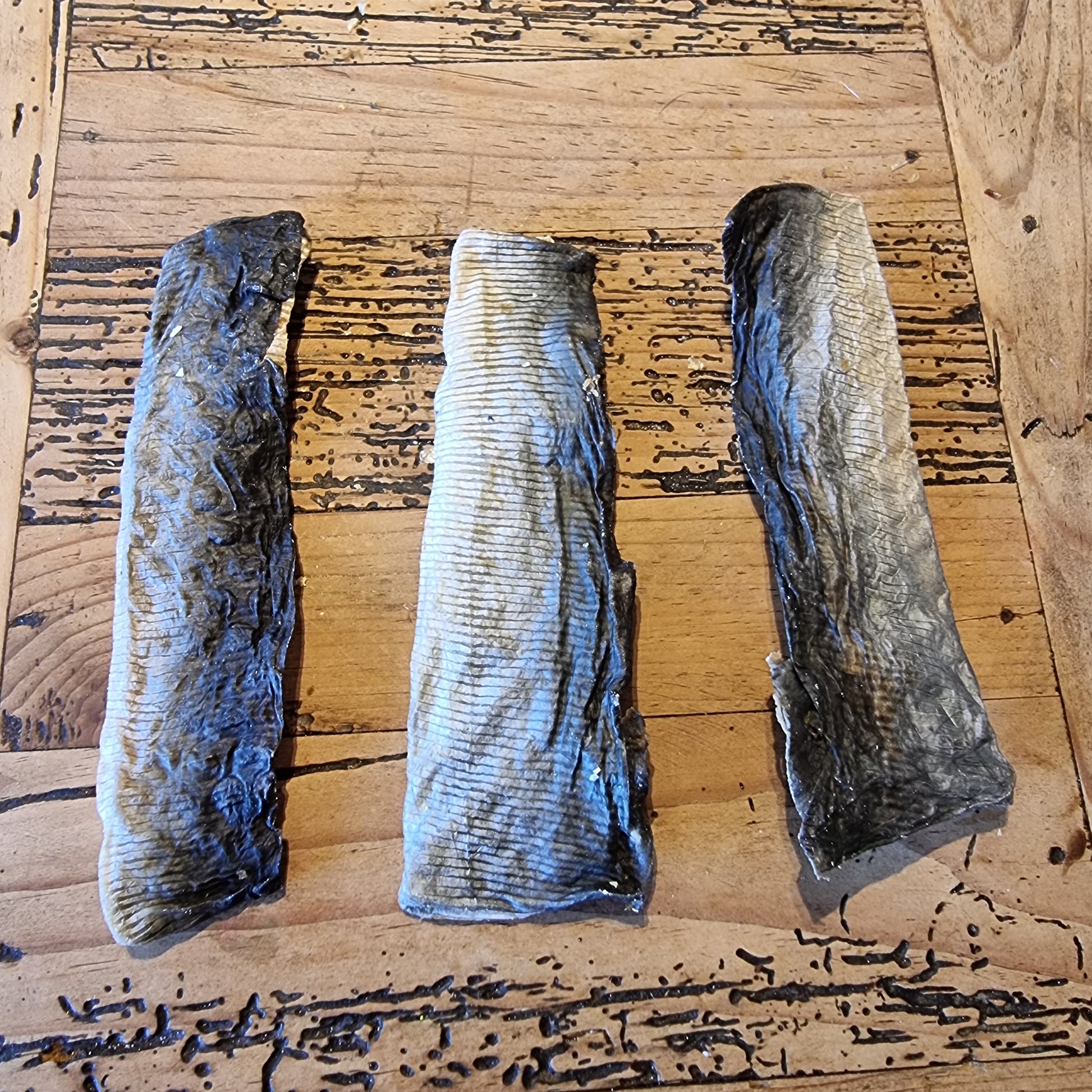 The air-dried skins are crunchy and are a great way to naturally clean your dogs teeth.