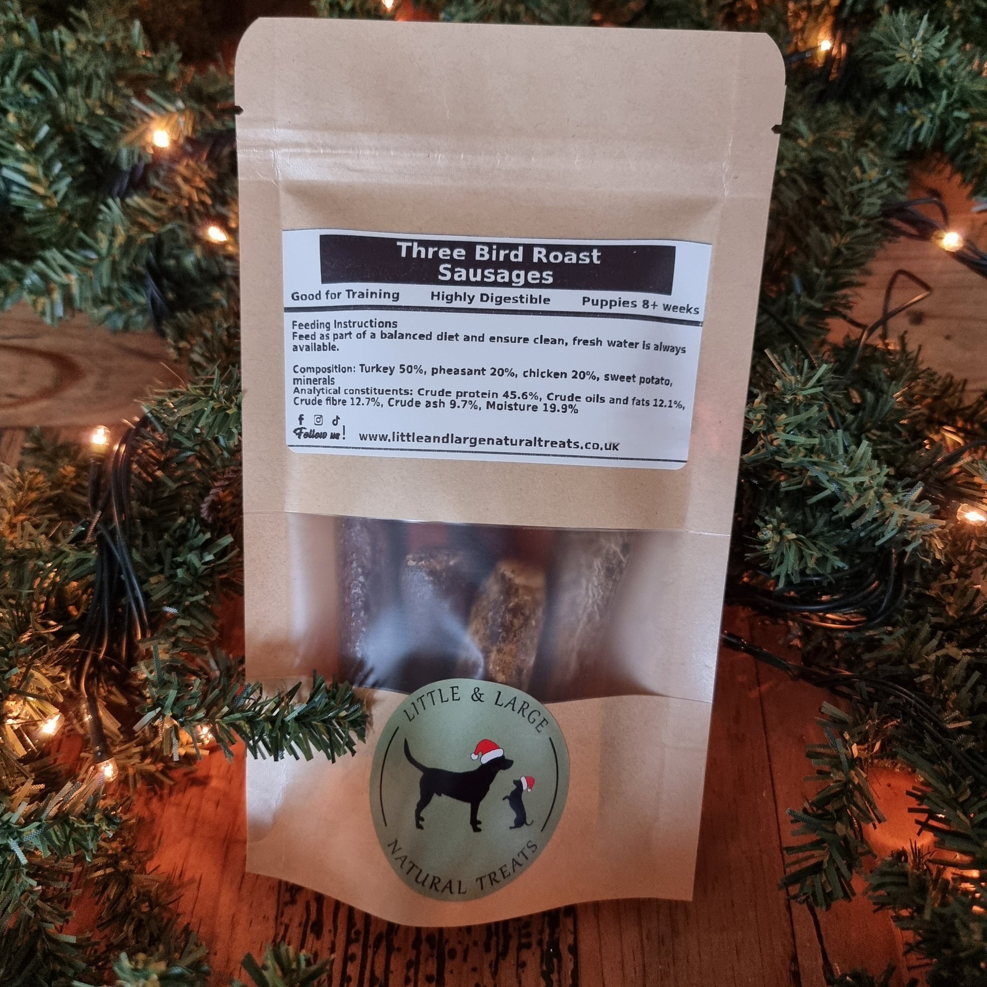 Make this holiday season extra special for your loyal companions with our festively mouth-watering delightful Three Bird Roast Sausages that bring the flavour of Christmas to their taste buds. Crafted with care and packed with wholesome goodness, these scrumptious and nutritious treats will have tails wagging and noses sniffing in anticipation during the most wonderful time of the year. High in protein, grain-free, made from all-natural ingredients, perfect for all dogs, these treats can be served whole or cut into smaller pieces for training rewards.